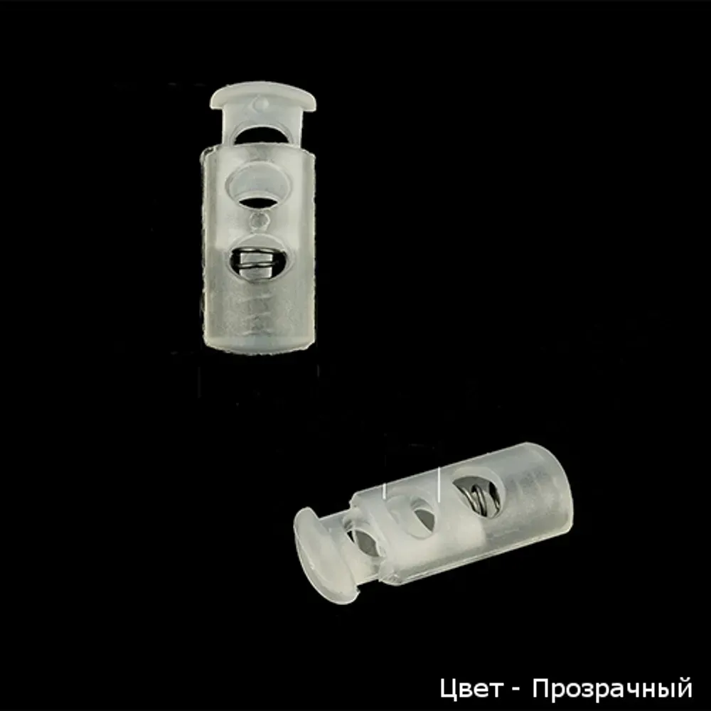 Пластиковий затискач циліндричної форми з двома отворами для регулювання розміру виробу шнуром.
